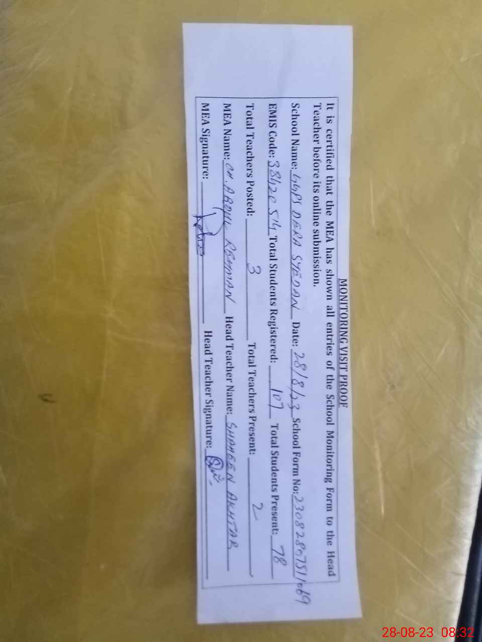 | Attendance Register | Head Teacher | MEA with School | Visit Proof |