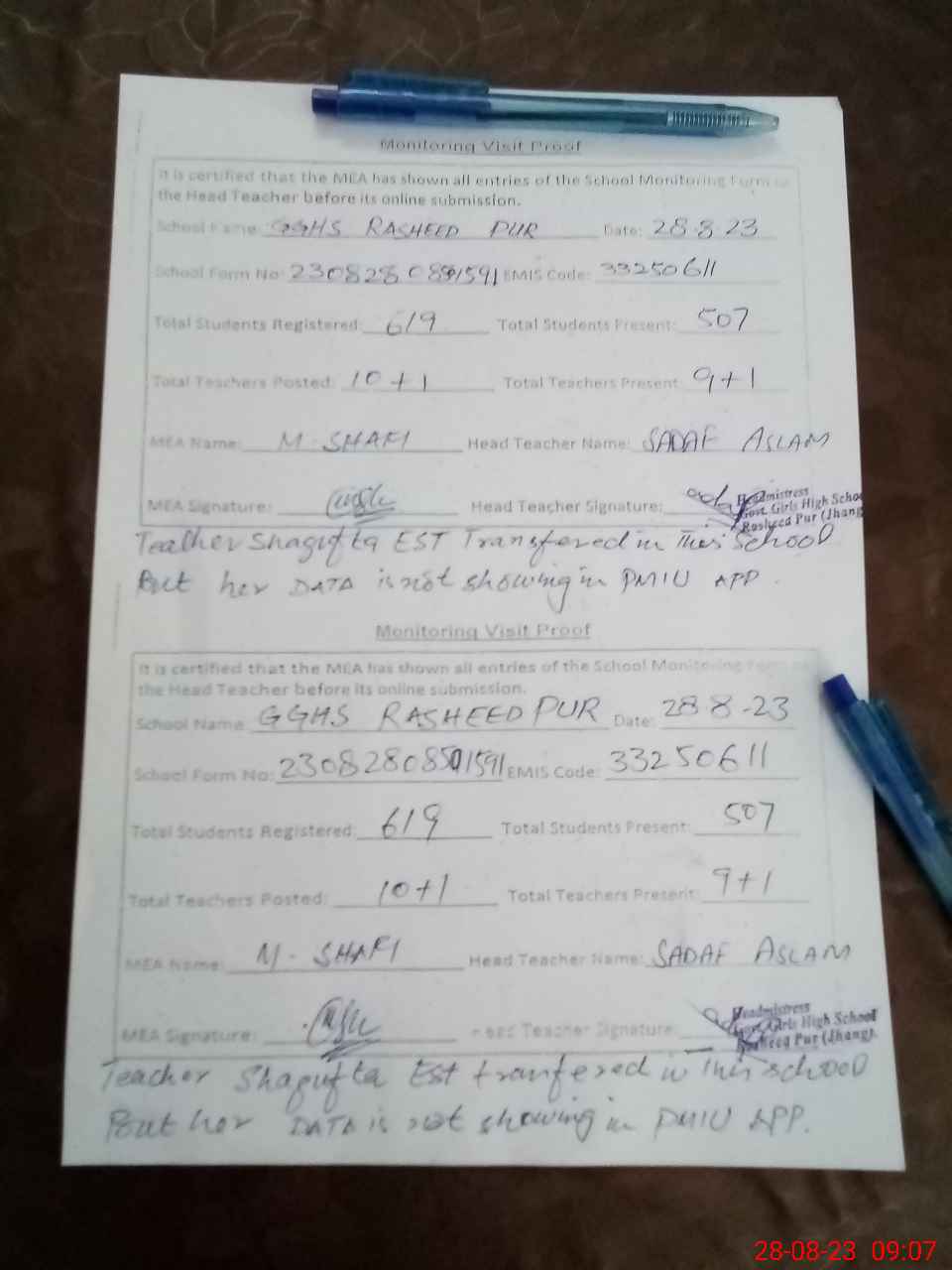 | Certified that this School was Inspected by the Undersigned MEA/DMO Today and the Information Stated Above is as Per Record. | |||||