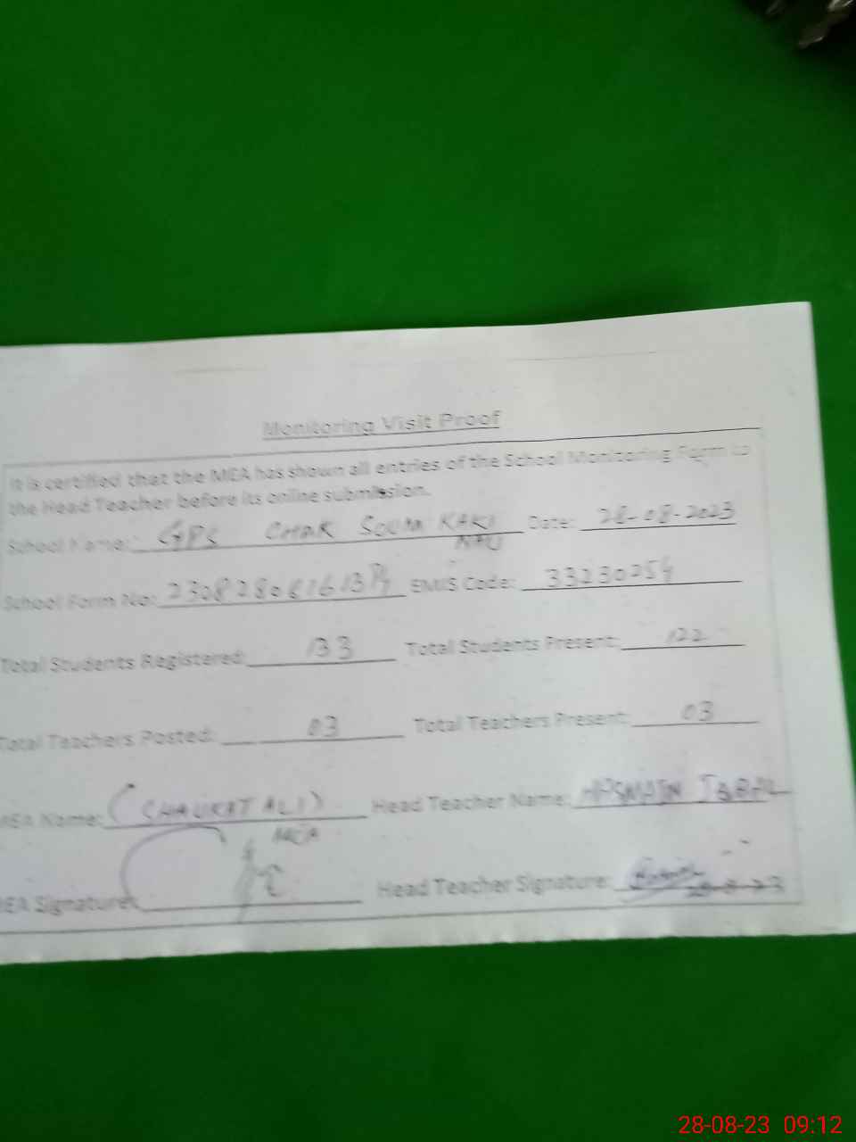 | Attendance Register | Head Teacher | MEA with School | Visit Proof |