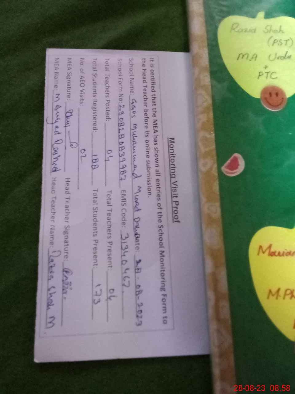 | Attendance Register | Head Teacher | MEA with School | Visit Proof |