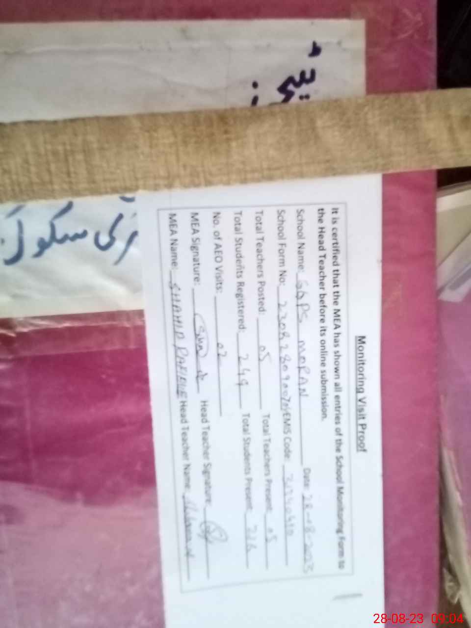 | Certified that this School was Inspected by the Undersigned MEA/DMO Today and the Information Stated Above is as Per Record. | |||||