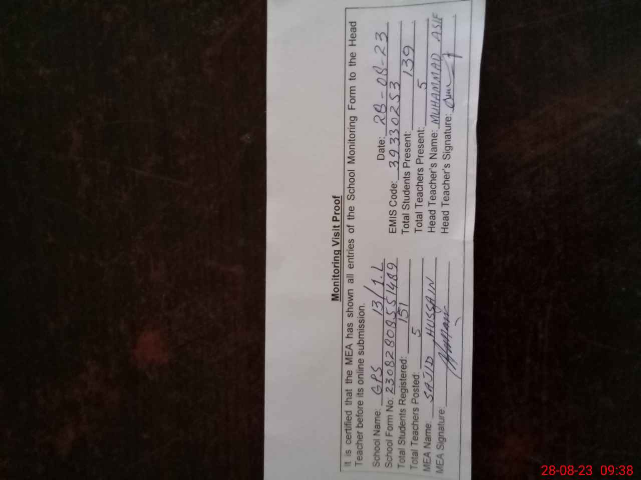 | Attendance Register | Head Teacher | MEA with School | Visit Proof |