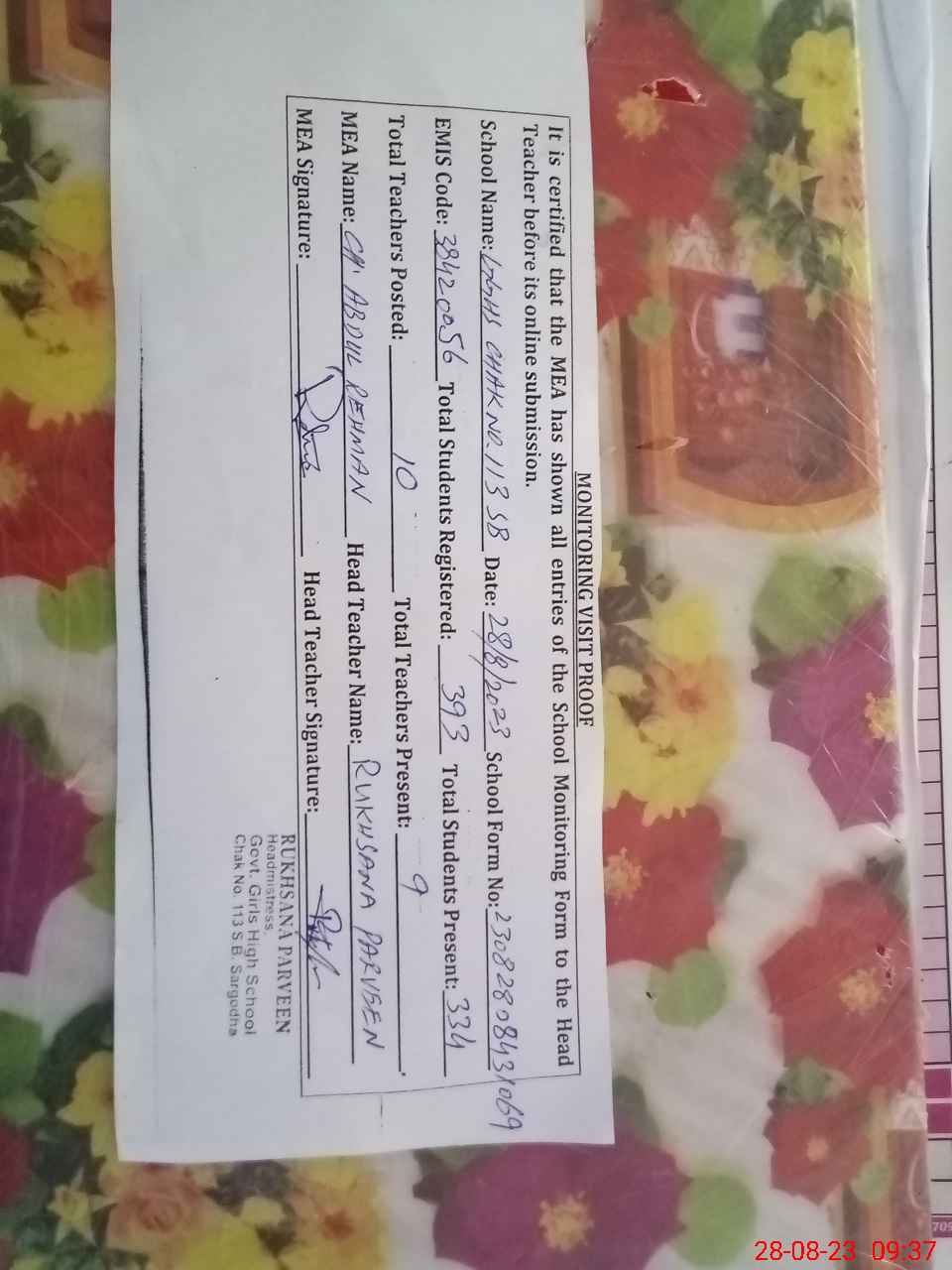 | Attendance Register | Head Teacher | MEA with School | Visit Proof |
