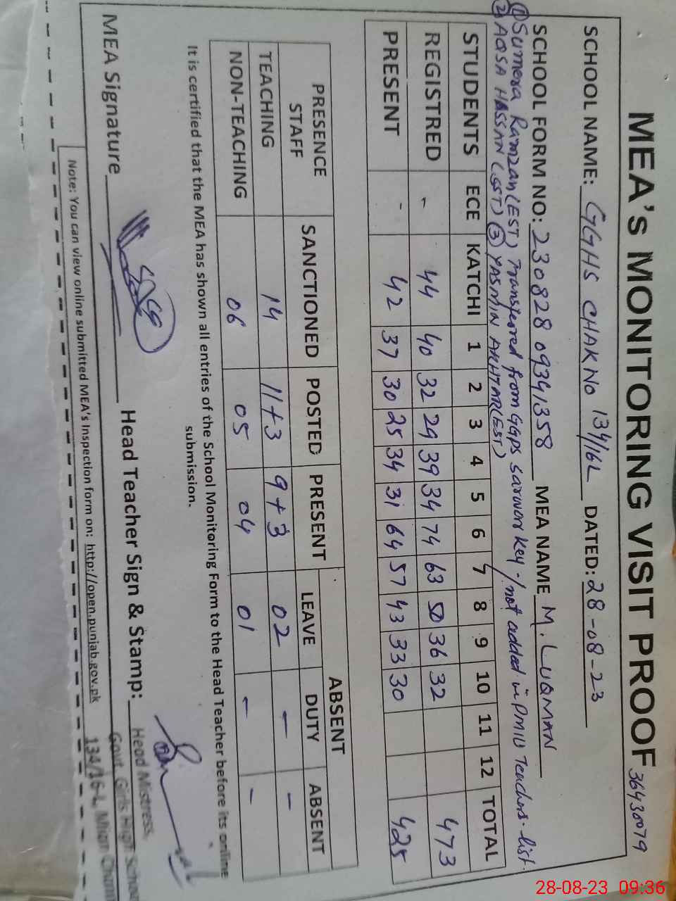 | Remarks (Use Separate Page if Required): Mst Sumrea Ramzan EST Aqsa Hassan SST and Yasmeen Akhtar EST posted at this school but yet not added in PMIU teachers list total strength of teachers is 14 | |||||
