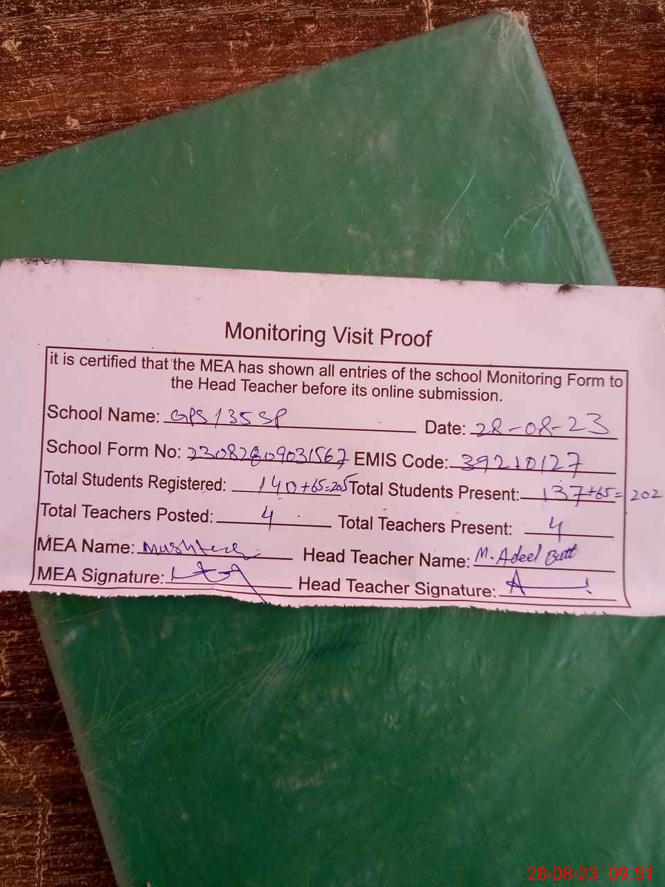 | Attendance Register | Head Teacher | MEA with School | Visit Proof |