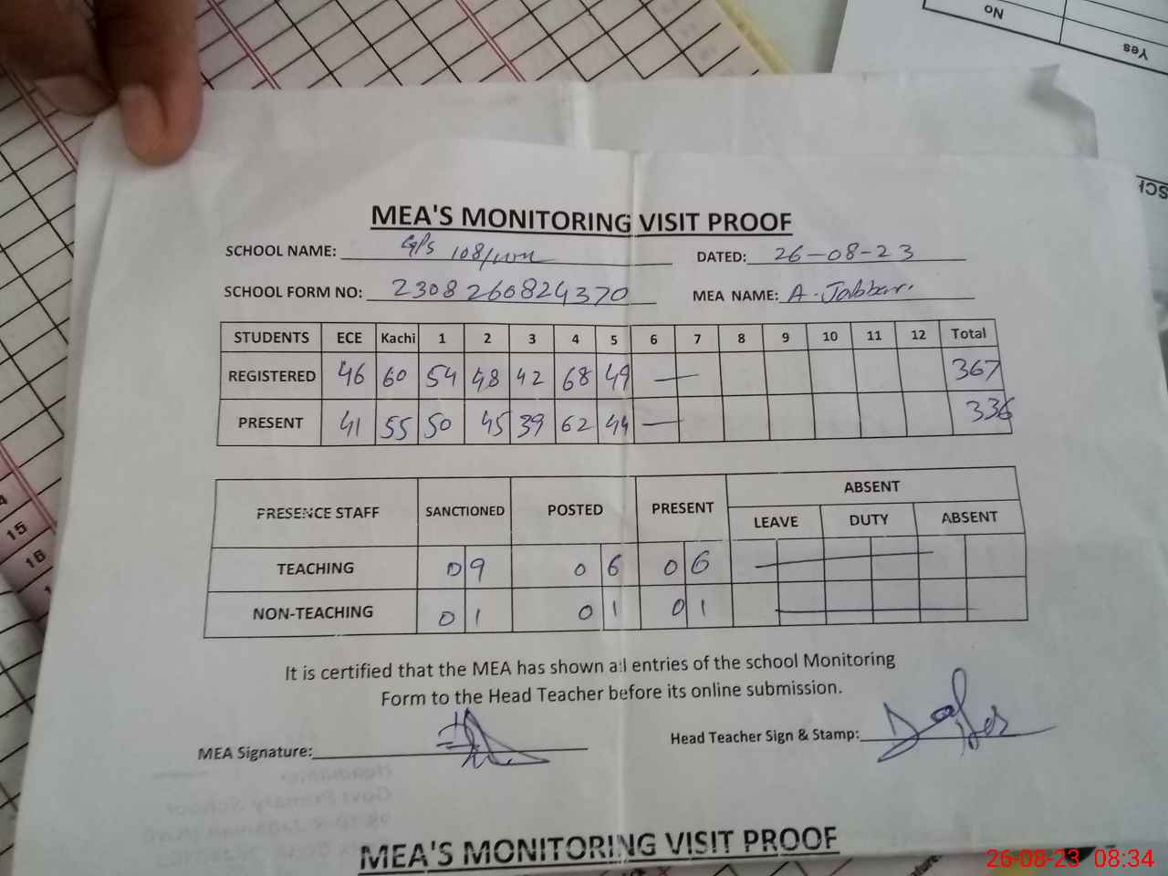 | Attendance Register | Head Teacher | MEA with School | Visit Proof |