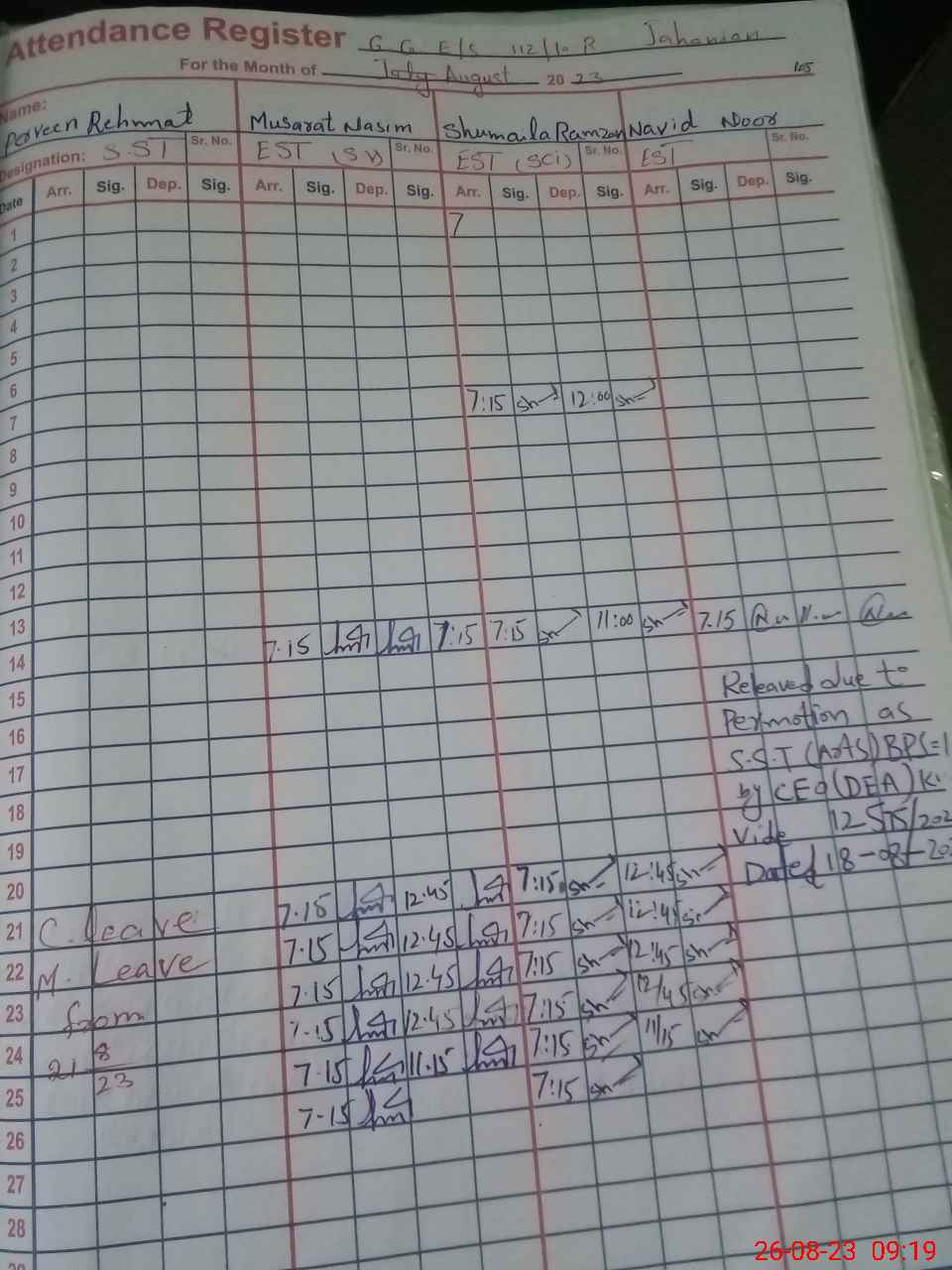 | CNIC | Full Name | Designation | R/C | Absence During Last Calender Month |