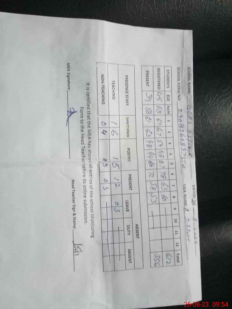 | Attendance Register | Head Teacher | MEA with School | Visit Proof |