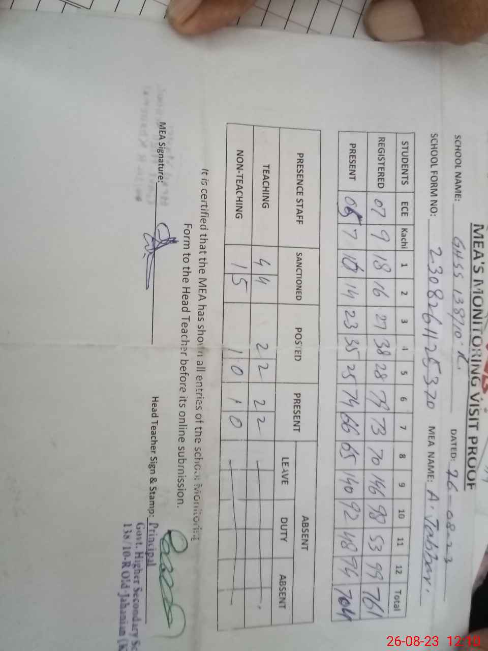 | Attendance Register | Head Teacher | MEA with School | Visit Proof |