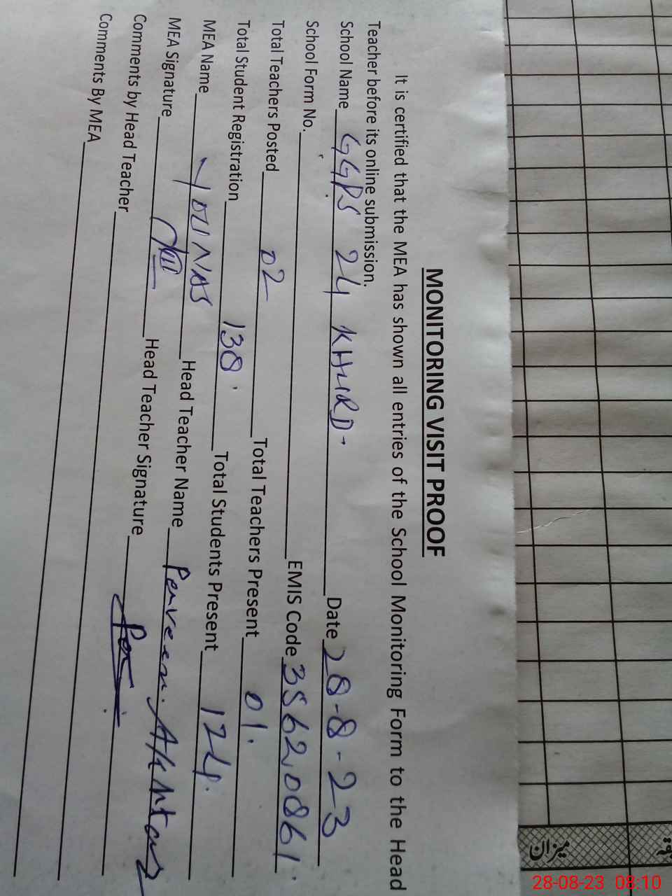 | Attendance Register | Head Teacher | MEA with School | Visit Proof |