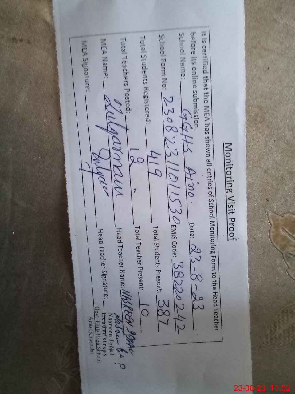 | Attendance Register | Head Teacher | MEA with School | Visit Proof |