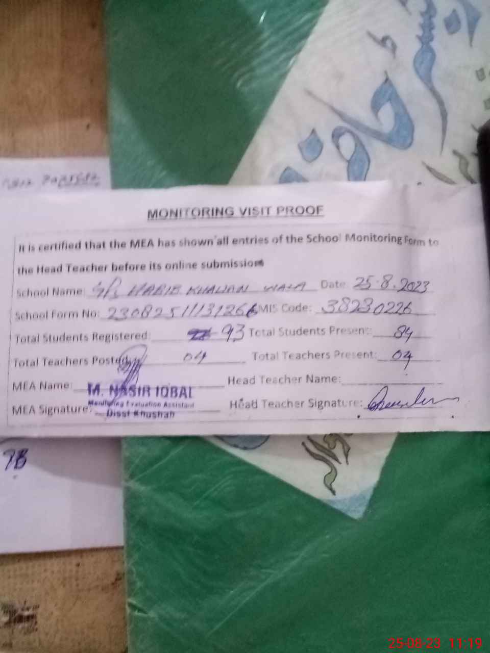 | Attendance Register | Head Teacher | MEA with School | Visit Proof |