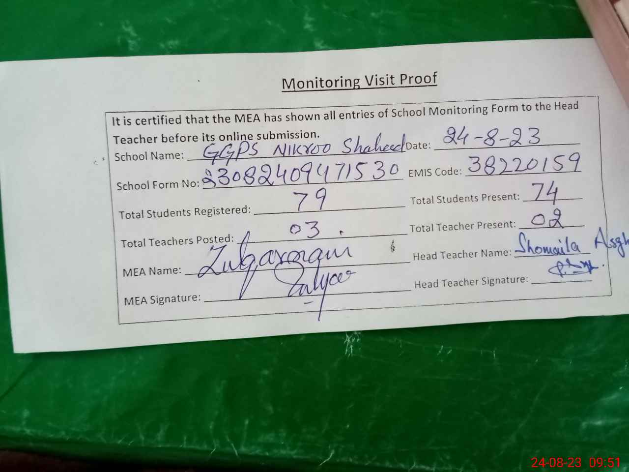 | Attendance Register | Head Teacher | MEA with School | Visit Proof |
