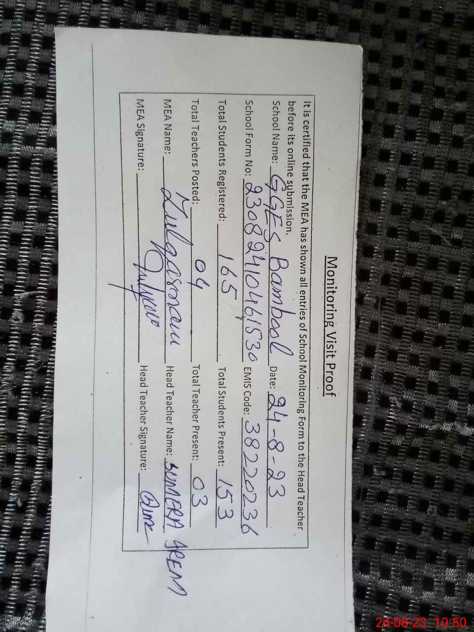 | Attendance Register | Head Teacher | MEA with School | Visit Proof |