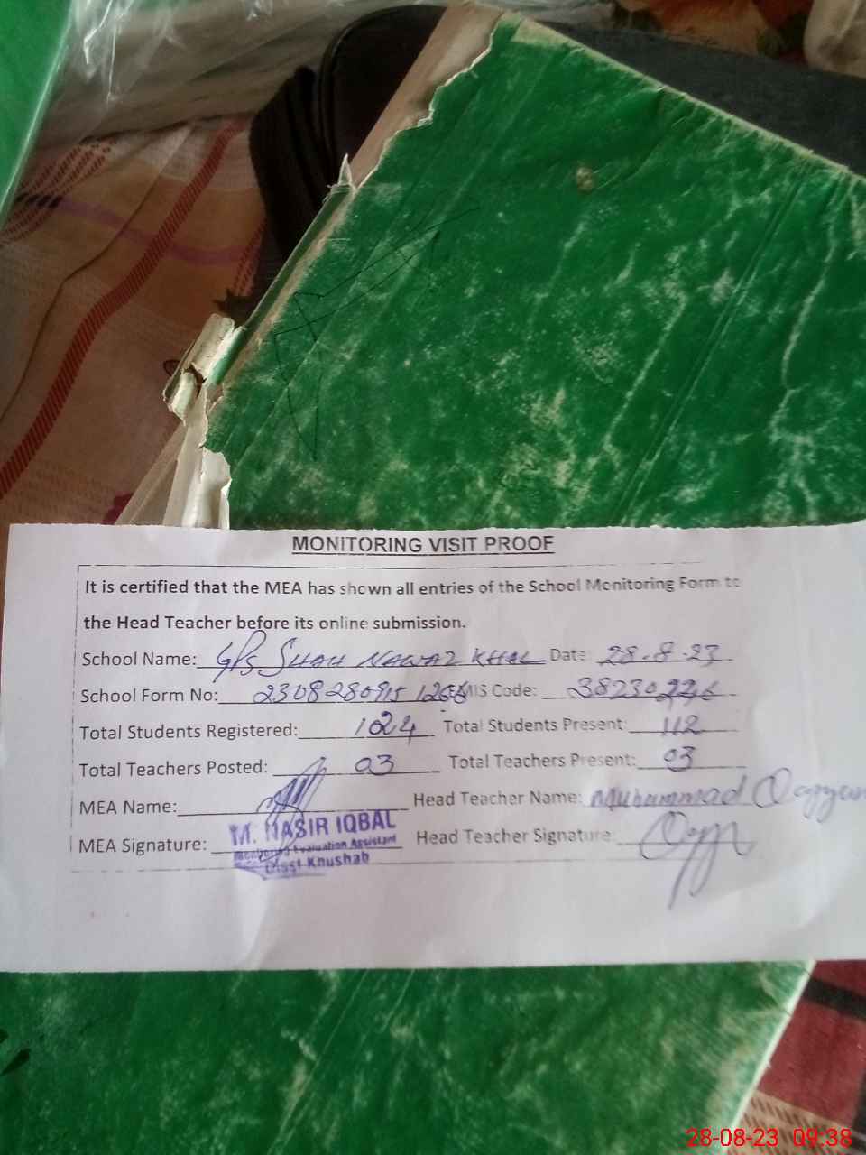 | Attendance Register | Head Teacher | MEA with School | Visit Proof |