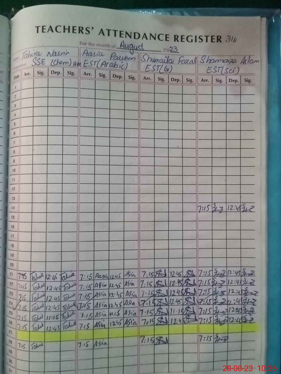 | No. of Students Present - Female | 30 | 0 | 24 | 20 | 21 | 15 | 21 | 35 | 21 | 36 | 28 | 251 | ||||