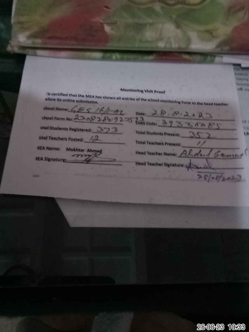 | EMIS Code: 39330085 | Name of School: GES CHAK NO. 16/1-AL | |||
