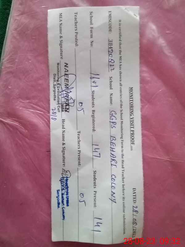 | EMIS Code: 38420822 | Name of School: GGPS BEHARI COLONY SARGODHA | |||