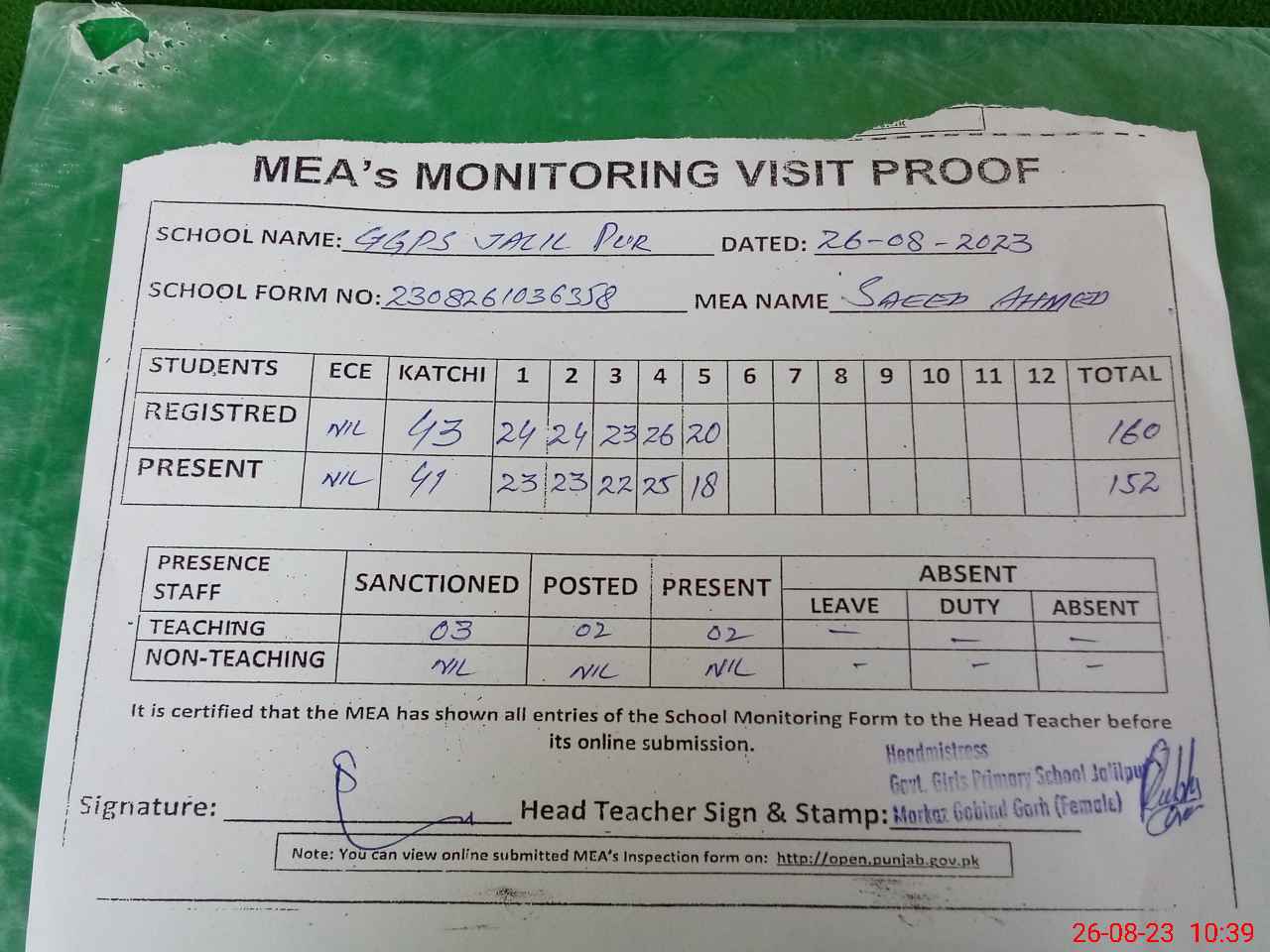 | Attendance Register | Head Teacher | MEA with School | Visit Proof |