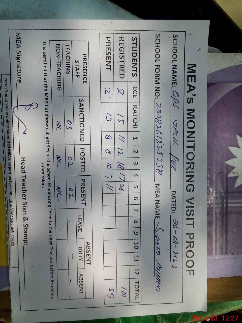 | Attendance Register | Head Teacher | MEA with School | Visit Proof |