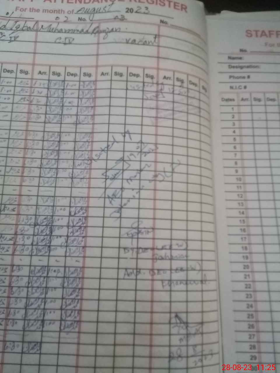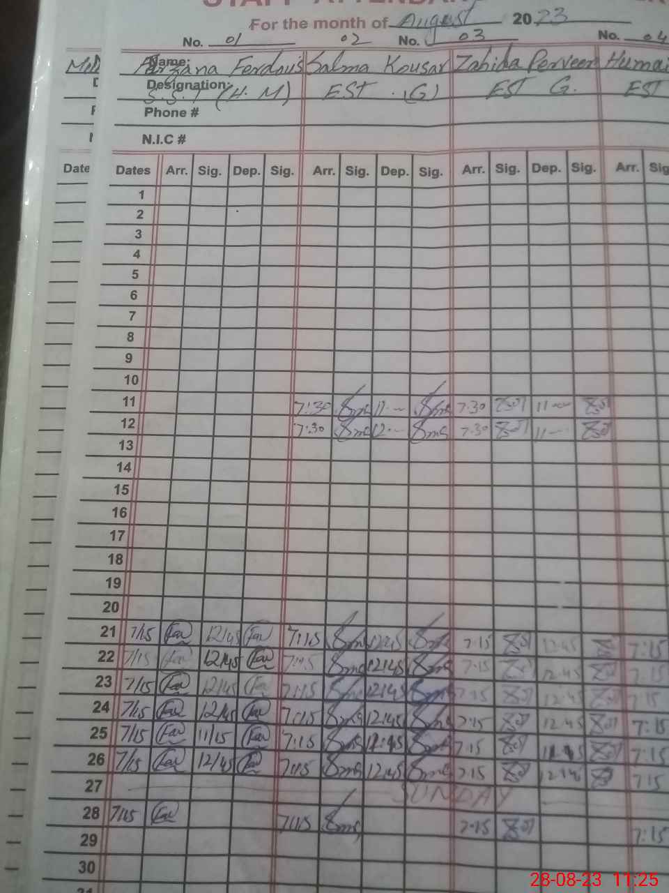 | CNIC | Full Name | Designation | R/C | Absence During Last Calender Month |