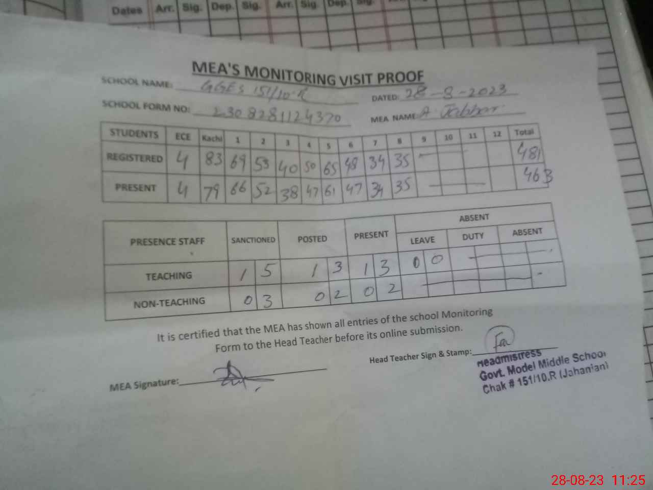 | Attendance Register | Head Teacher | MEA with School | Visit Proof |
