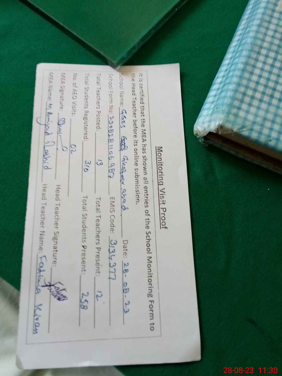 | Attendance Register | Head Teacher | MEA with School | Visit Proof |