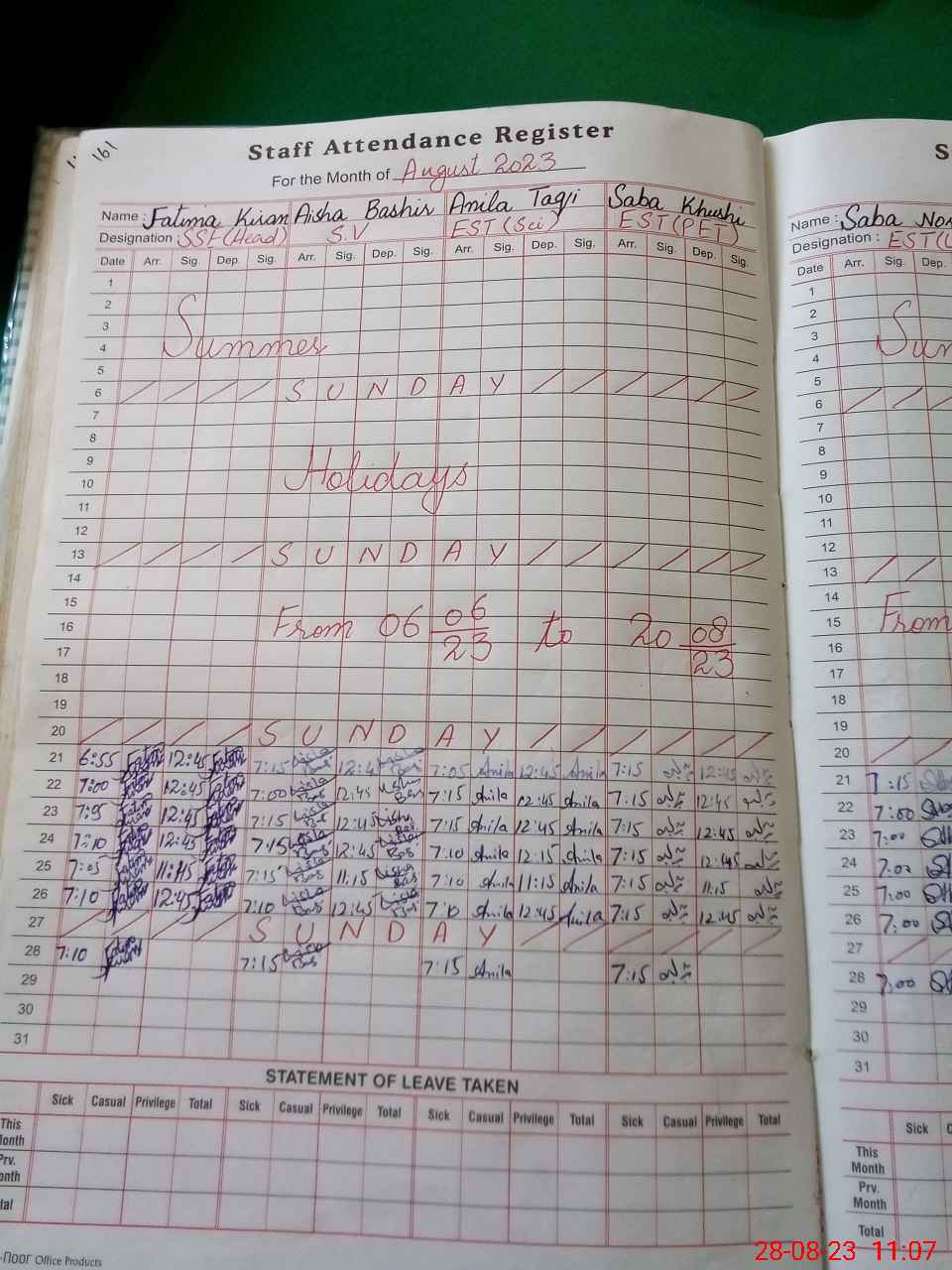 | Remarks (Use Separate Page if Required): PST Sadaf shafique marked absent as her sanctioned leave not produced at the Time of inspection | |||||