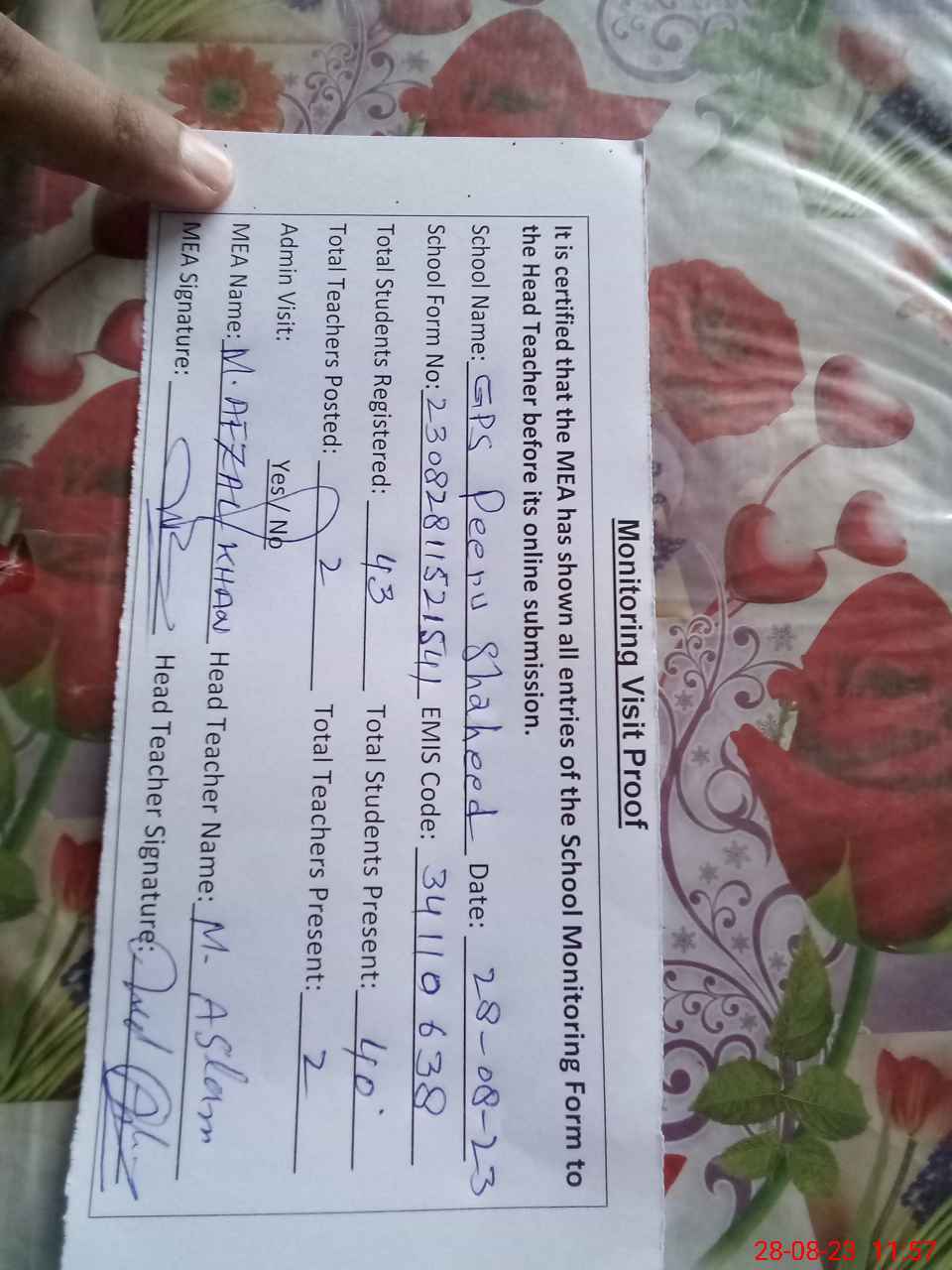 | Attendance Register | Head Teacher | MEA with School | Visit Proof |