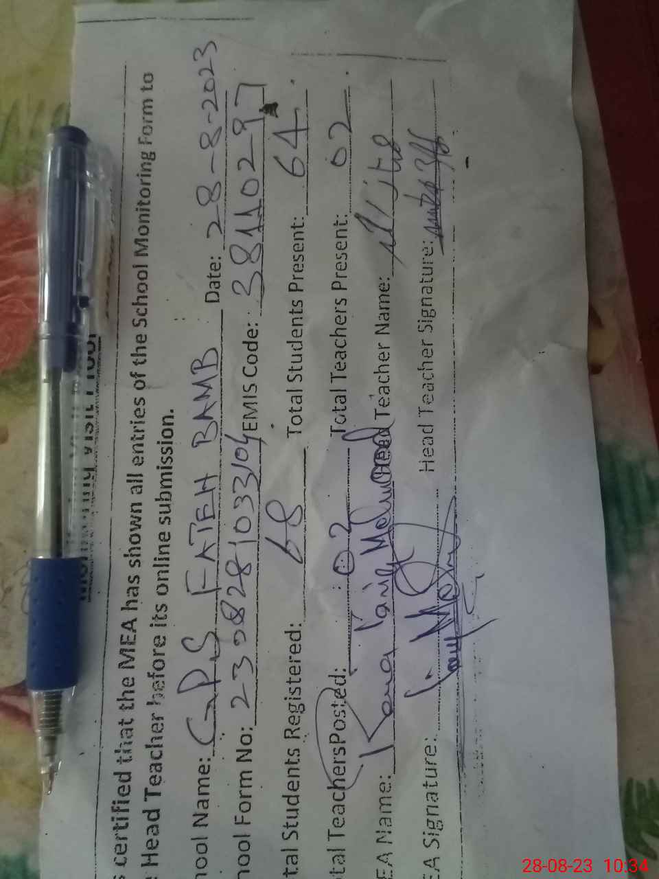 | Attendance Register | Head Teacher | MEA with School | Visit Proof |