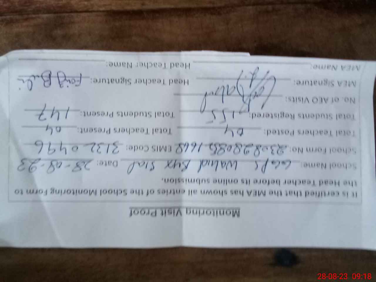 | Attendance Register | Head Teacher | MEA with School | Visit Proof |