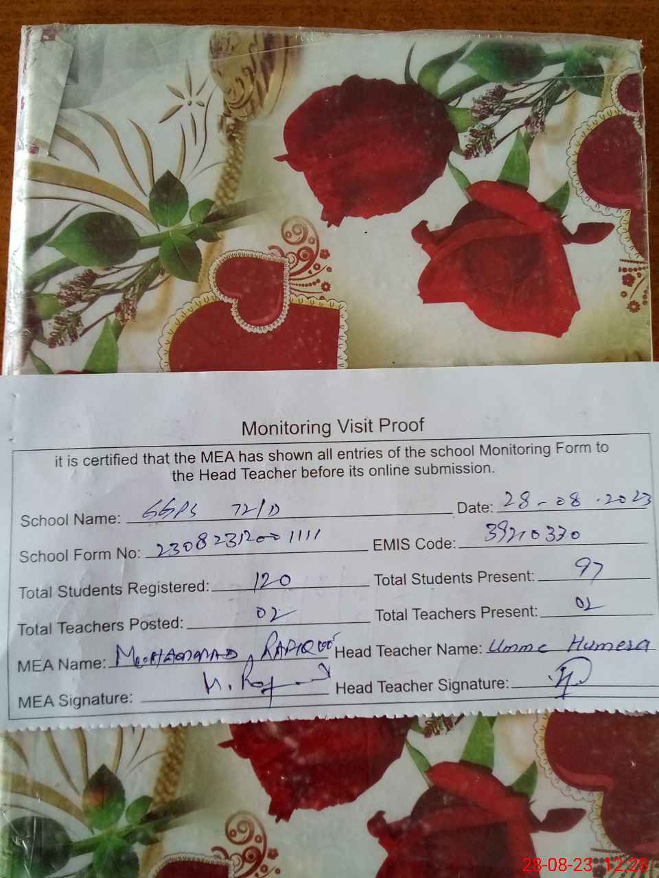 | Attendance Register | Head Teacher | MEA with School | Visit Proof |