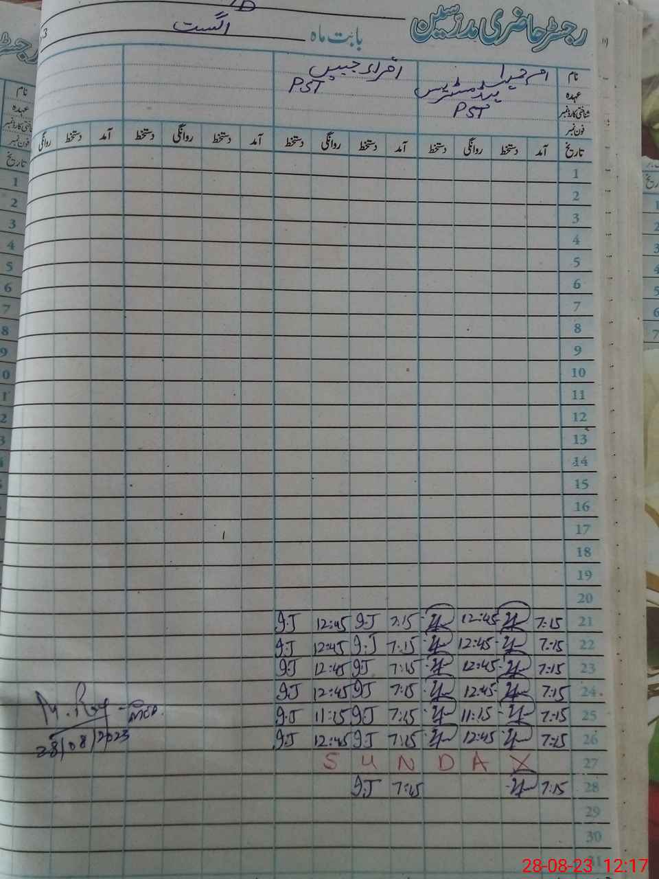 | CNIC | Full Name | Designation | R/C | Absence During Last Calender Month |
