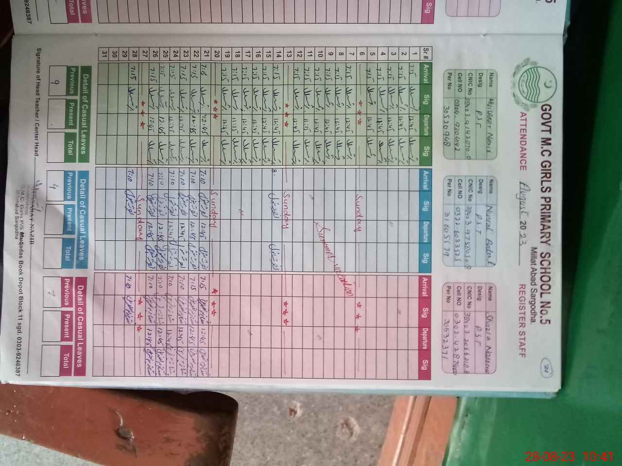 | CNIC | Full Name | Designation | R/C | Absence During Last Calender Month |