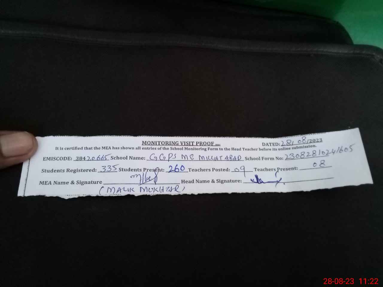 | Attendance Register | Head Teacher | MEA with School | Visit Proof |