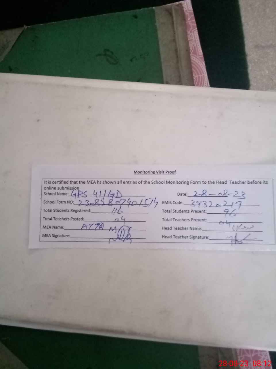 | Attendance Register | Head Teacher | MEA with School | Visit Proof |