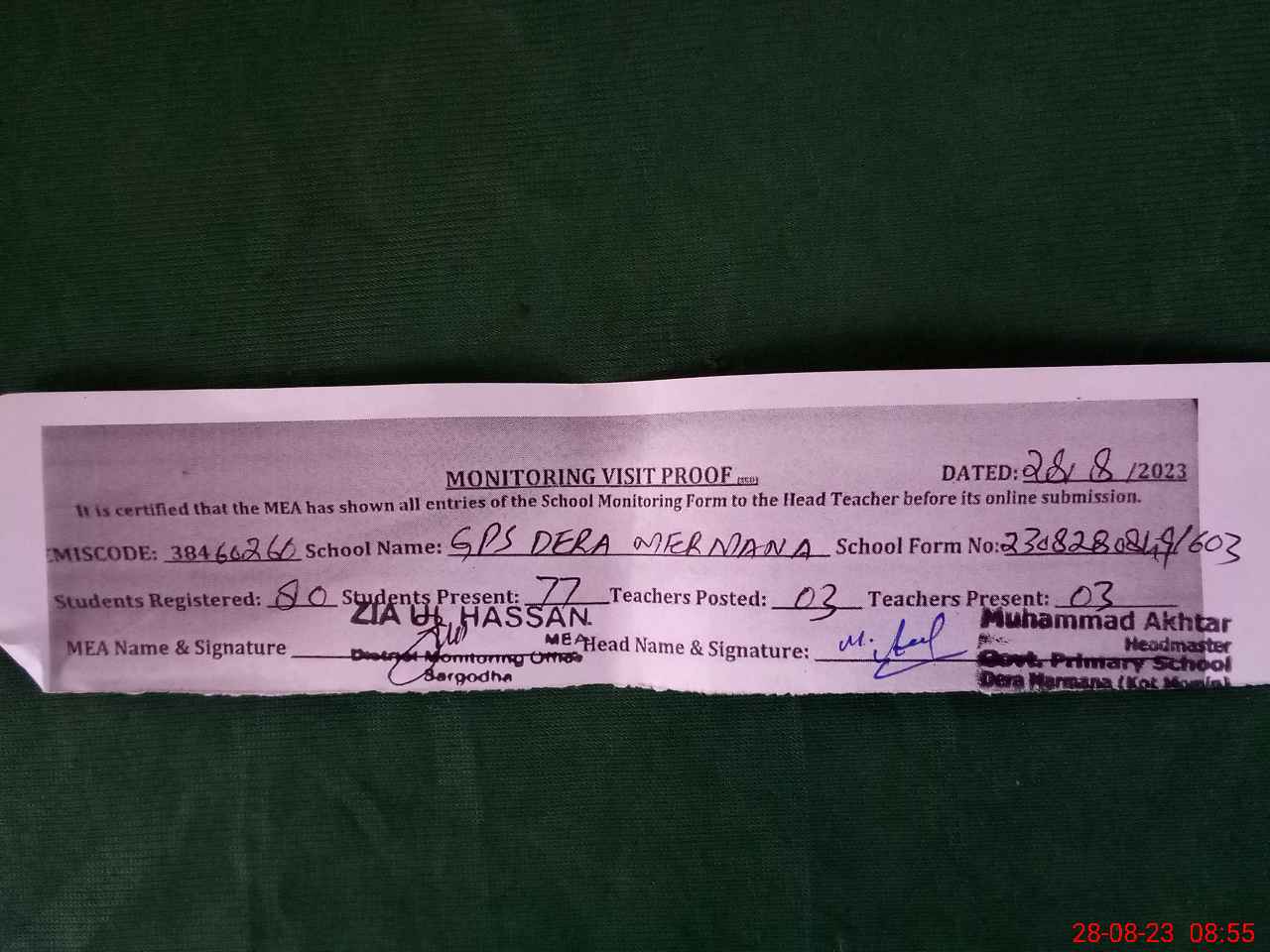 | Monitoring Date: 28-08-2023 | Start Time: 28-08-2023 08:23 AM | End Time: 28-08-2023 09:13 AM | Name of MEA: ZI**** ULHA**** | |