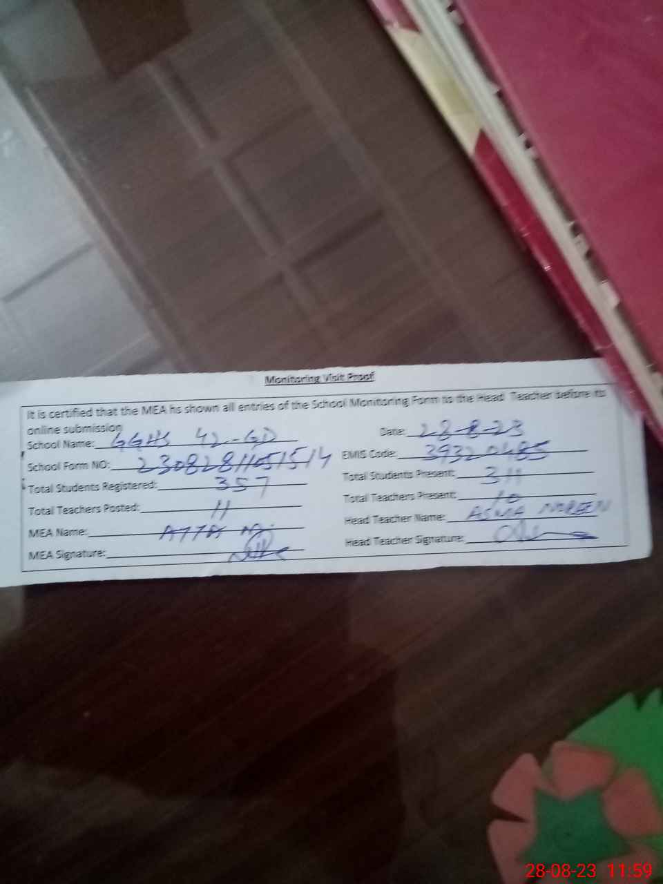| Attendance Register | Head Teacher | MEA with School | Visit Proof |