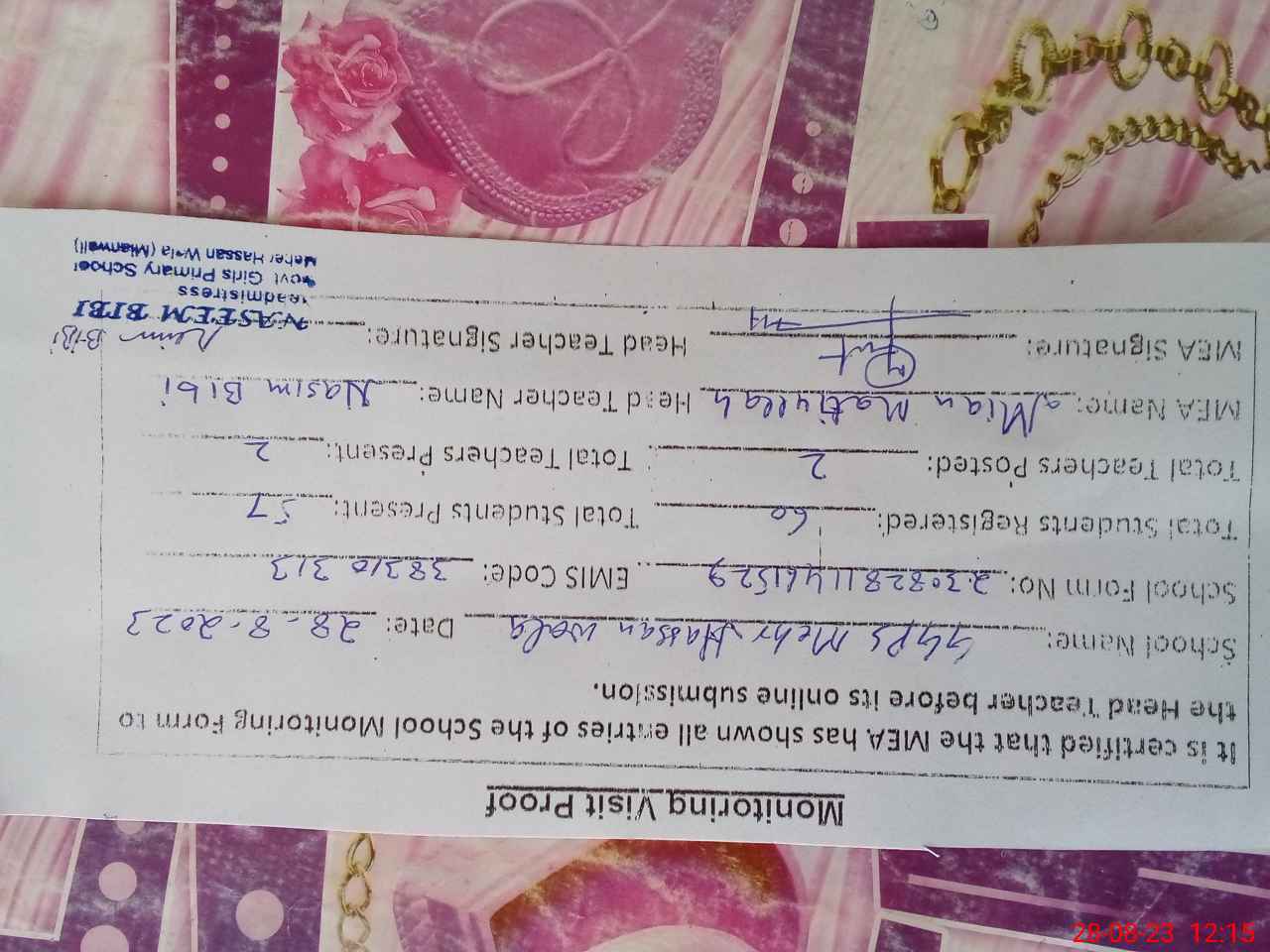 | Certified that this School was Inspected by the Undersigned MEA/DMO Today and the Information Stated Above is as Per Record. | |||||