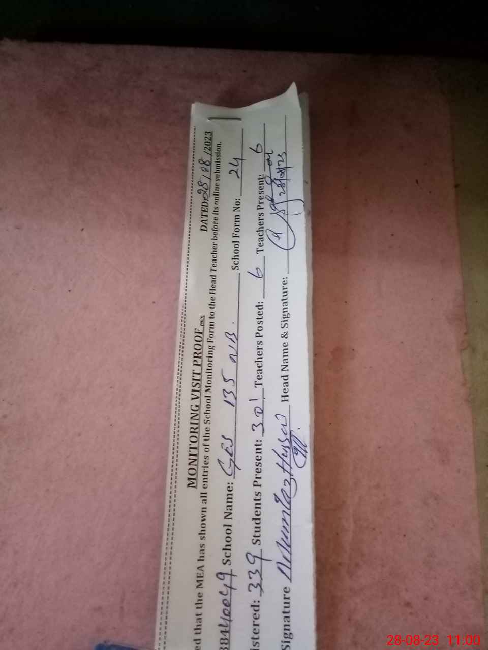 | Attendance Register | Head Teacher | MEA with School | Visit Proof |