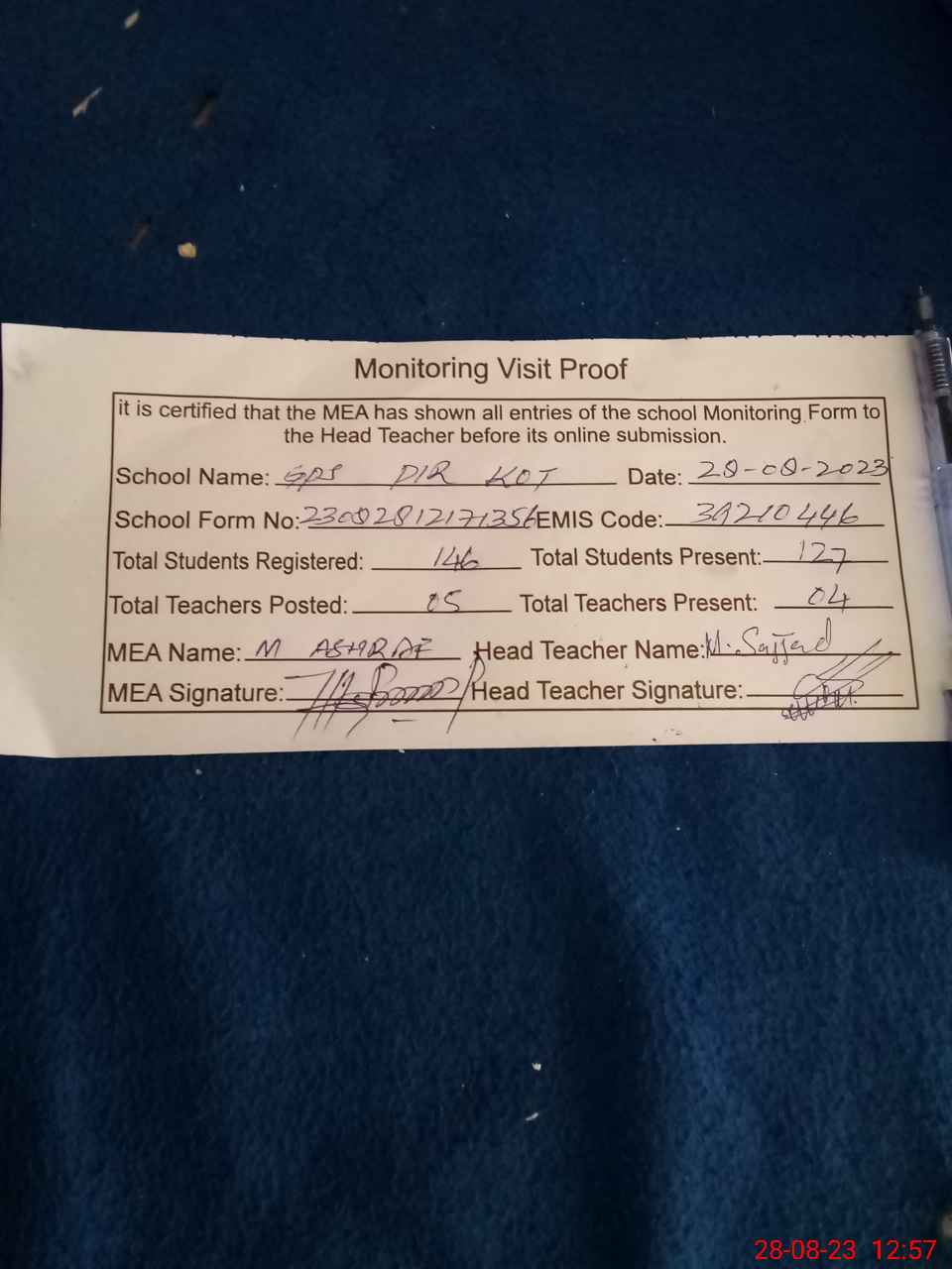 | Attendance Register | Head Teacher | MEA with School | Visit Proof |