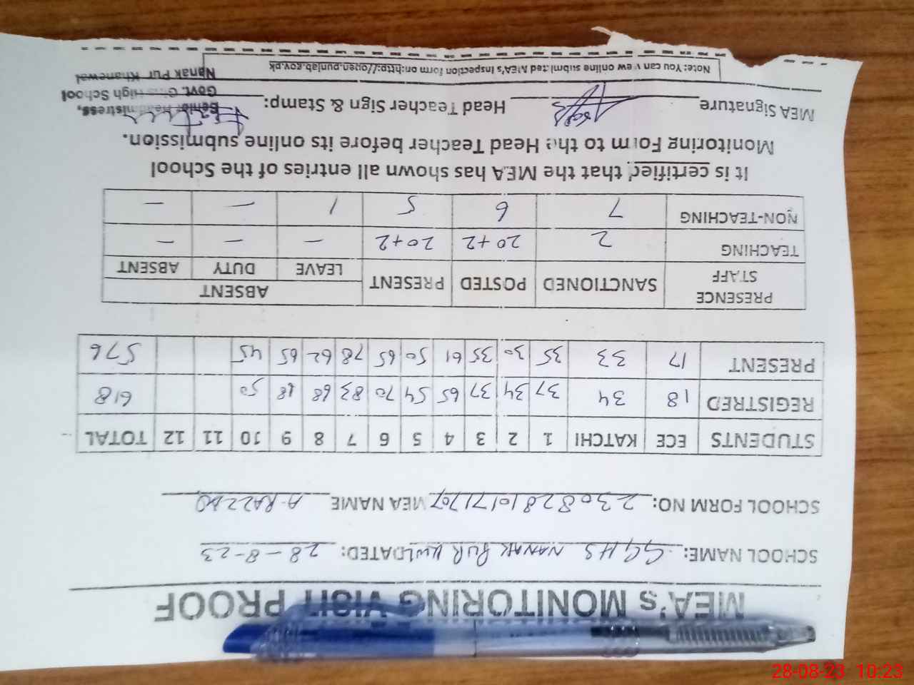 | Attendance Register | Head Teacher | MEA with School | Visit Proof |