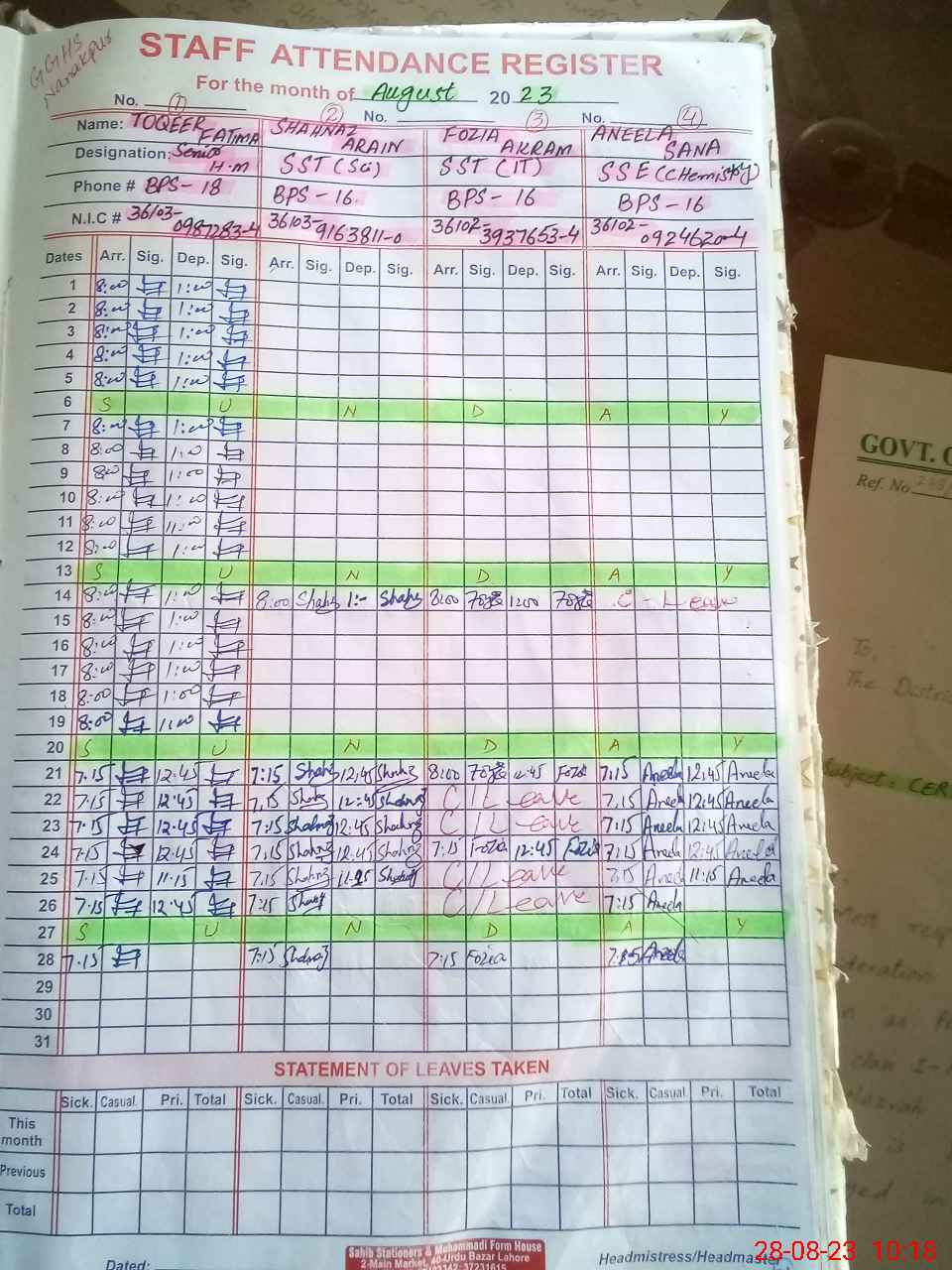 | CNIC | Full Name | Designation | R/C | Absence During Last Calender Month |