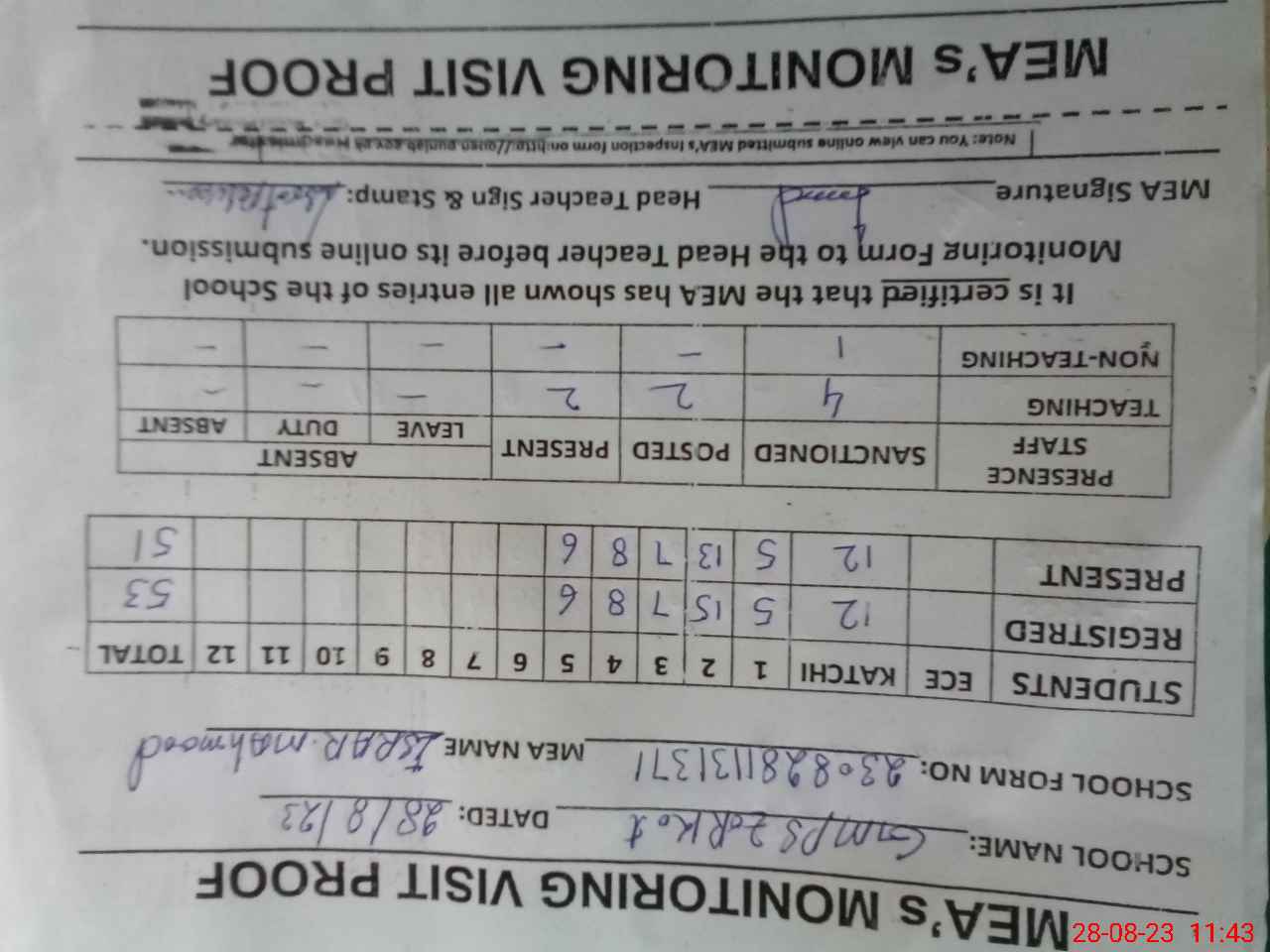 | Attendance Register | Head Teacher | MEA with School | Visit Proof |