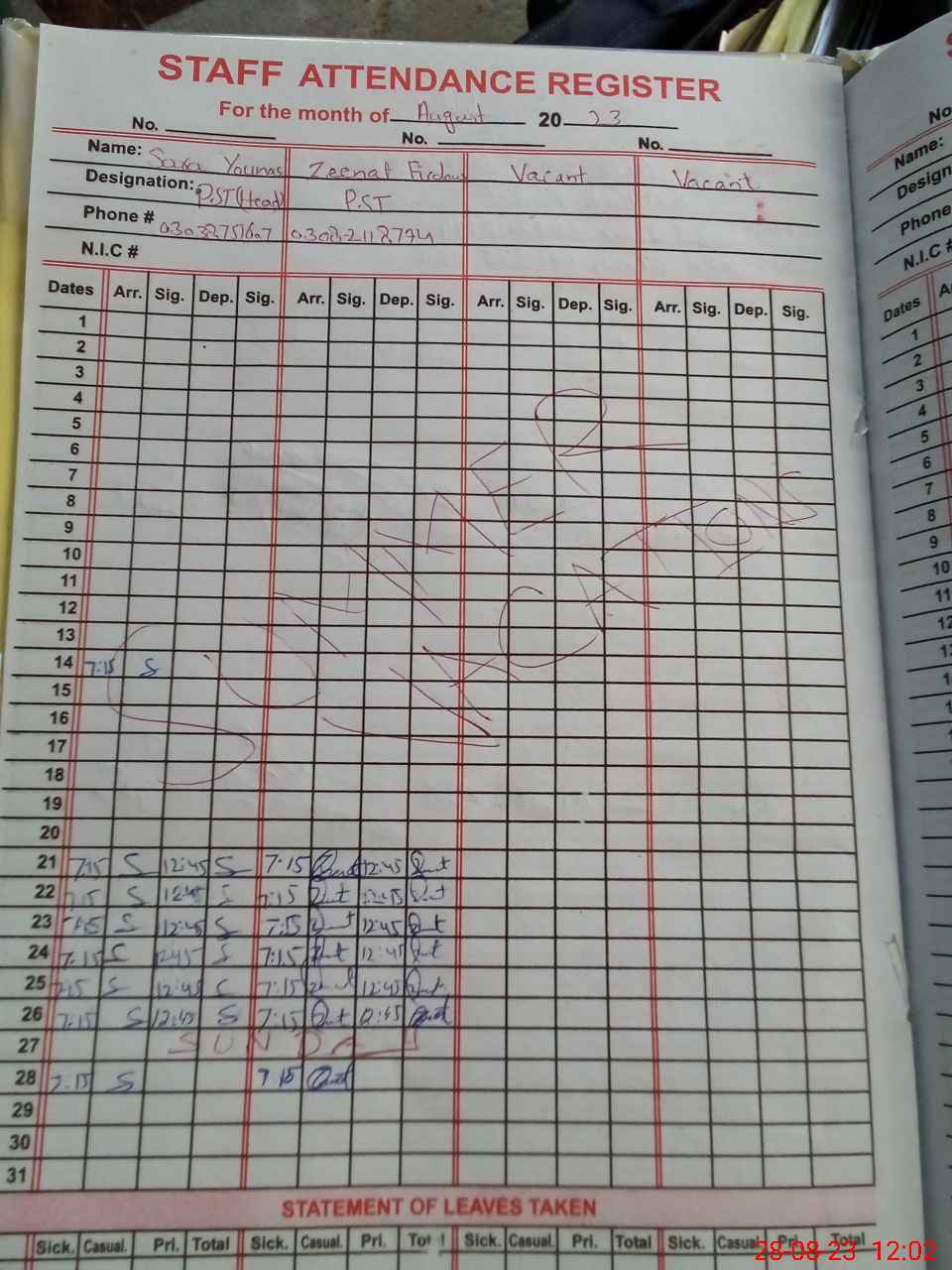 | CNIC | Full Name | Designation | R/C | Absence During Last Calender Month |