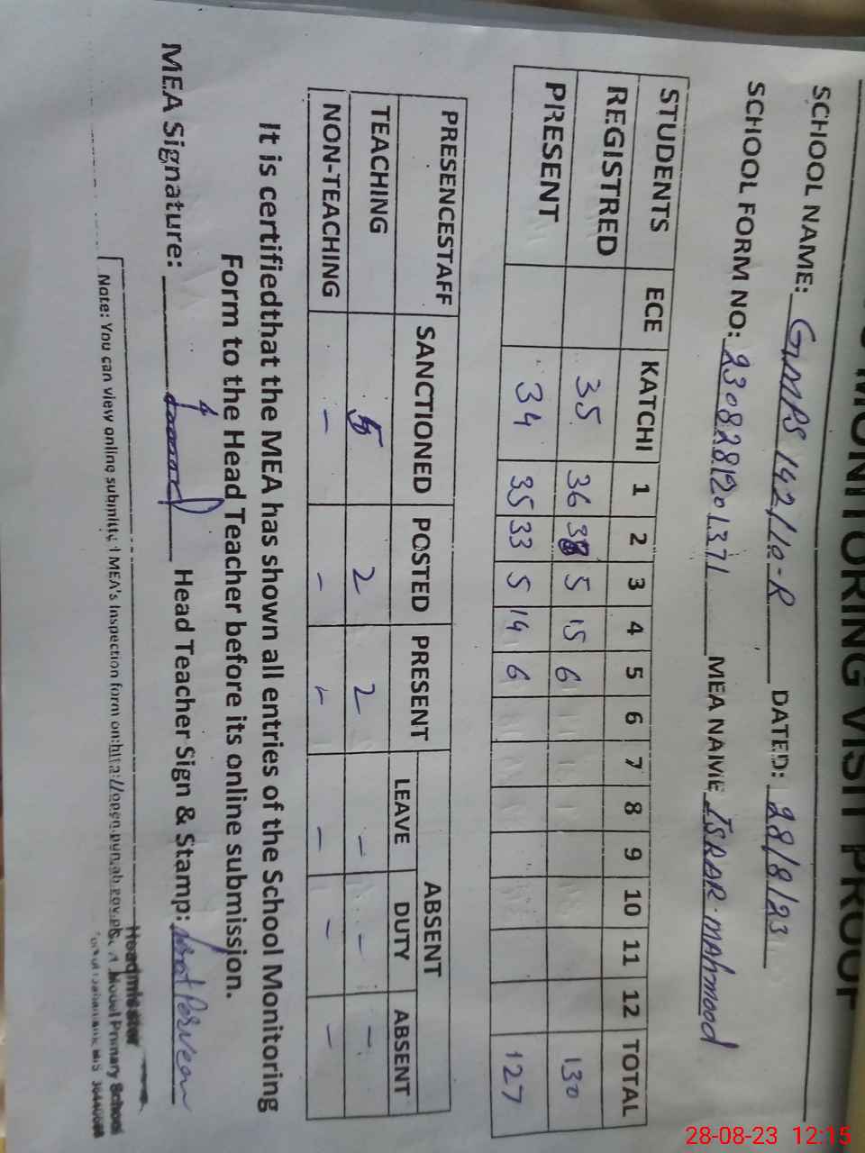 | Attendance Register | Head Teacher | MEA with School | Visit Proof |