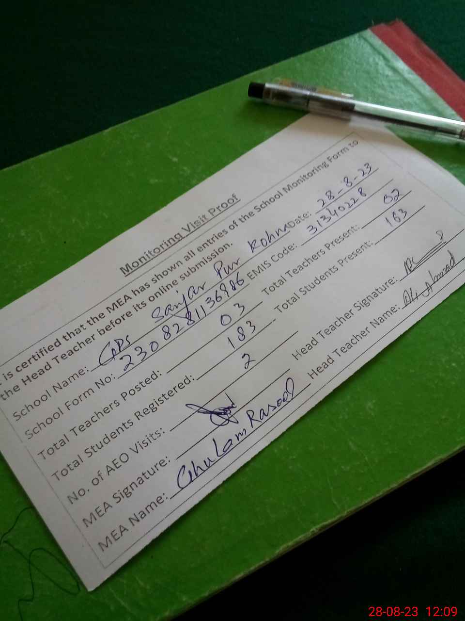 | Attendance Register | Head Teacher | MEA with School | Visit Proof |