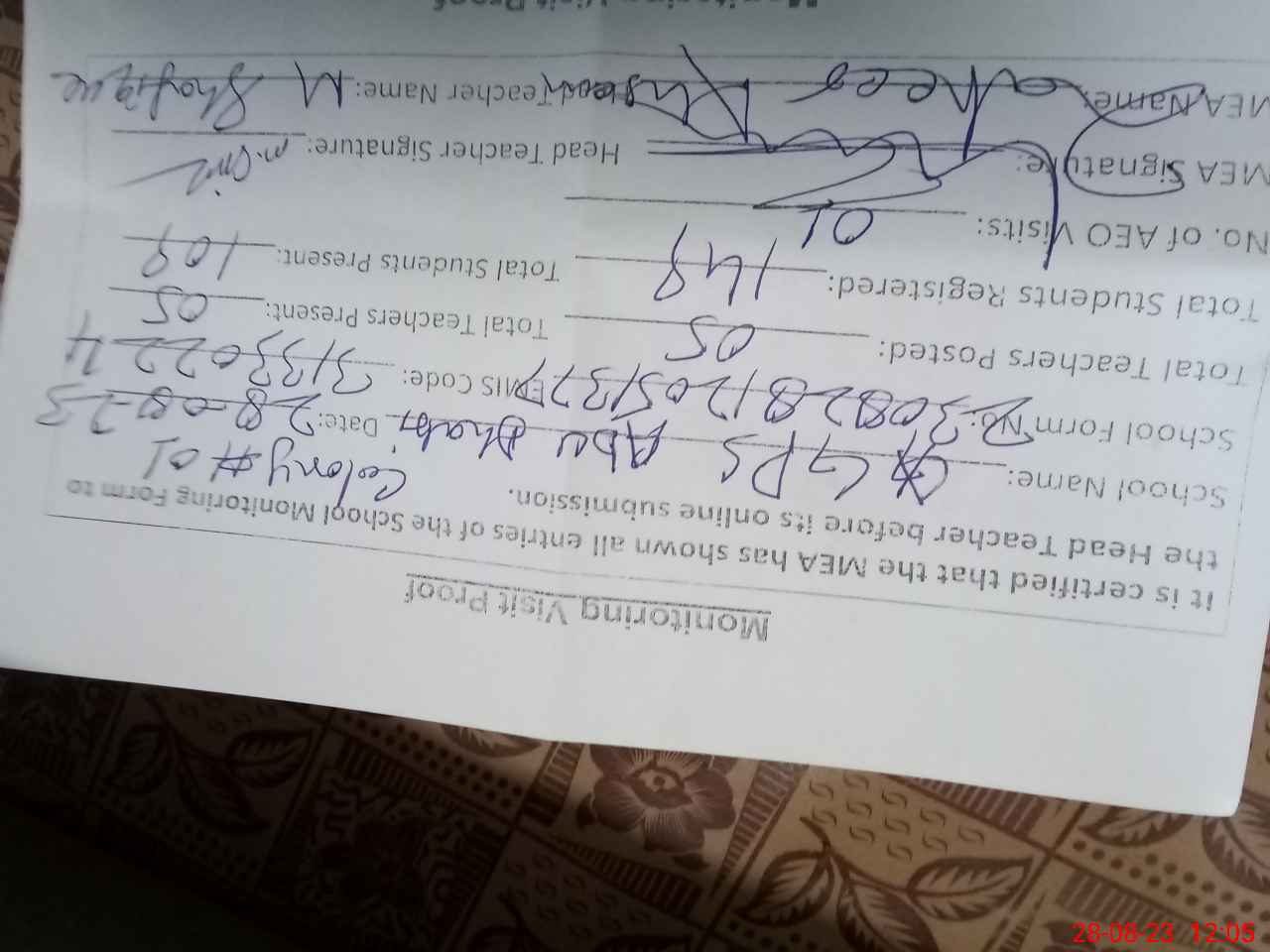| Monitoring Date: 28-08-2023 | Start Time: 28-08-2023 11:27 AM | End Time: 28-08-2023 12:09 PM | Name of MEA: Za**** Ah**** | |
