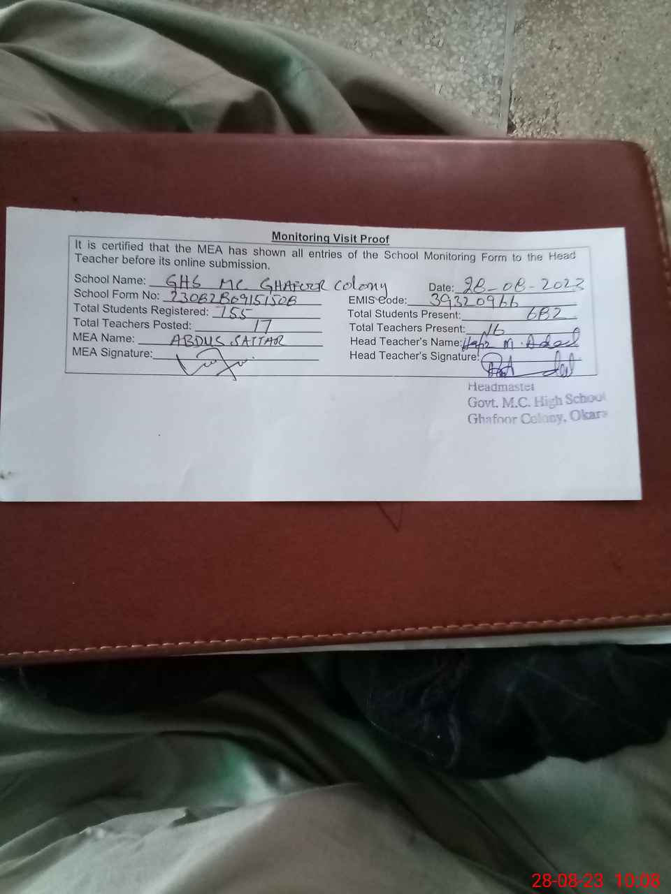 | Attendance Register | Head Teacher | MEA with School | Visit Proof |