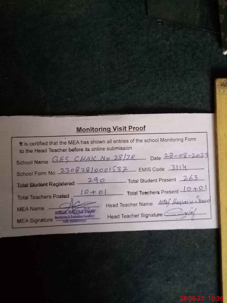 | Attendance Register | Head Teacher | MEA with School | Visit Proof |